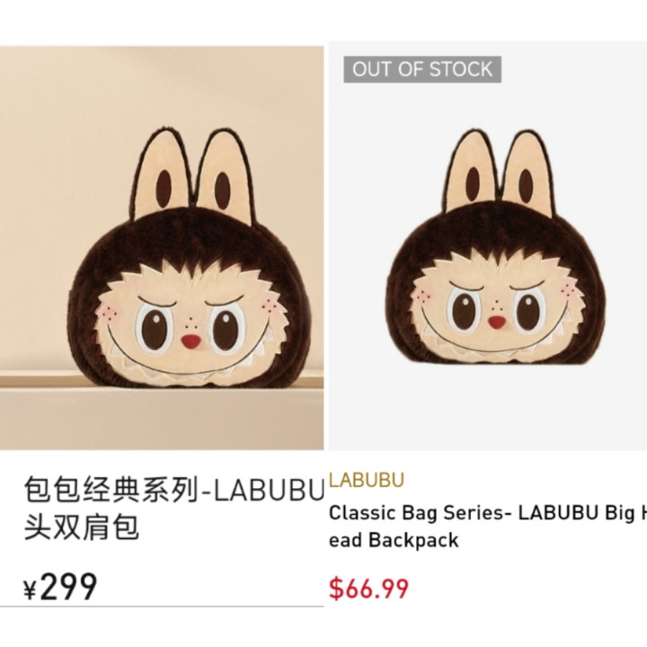 记者调查发现,泡泡玛特产品在海外市场普遍存在显著溢价。例如一款国内售价299元的大头双肩包,美国市场售价达66.99美元(约合人民币487.2元);“MEGALABUBU400%素描”产品国内售价1299元,美国售价则高达289.99美元(约合人民币2109.02元)。